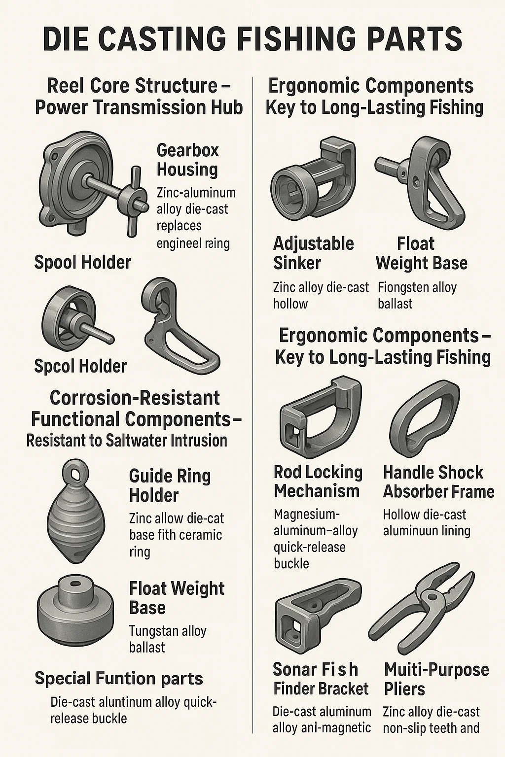 Kuolla kalastusosien valusta ovat ydinmetallikomponentteja, jotka on valmistettu käyttämällä korkeapaineista valua. Ne käsittelevät tärkeimpiä kalastusvaatimuksia, kuten kevyt, korroosionkestävyys ja toiminnallinen luotettavuus. Tärkeimmät sovellukset ja ominaisuudet ovat seuraavat: