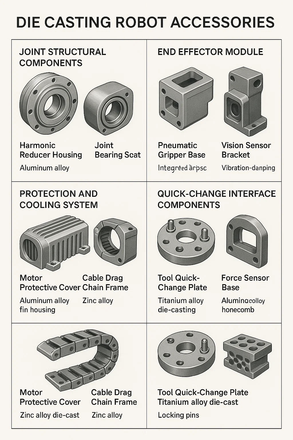 Kuole robottivarusteet ovat ydinmetallikomponentteja, jotka on valmistettu korkeapaineisen valuprosessin kautta. Ne vastaavat teollisuusrobotien ydinvaatimuksia, mukaan lukien tarkkuus, kevyt ja kestävyys. Tärkeimmät sovellukset ja ominaisuudet ovat seuraavat: