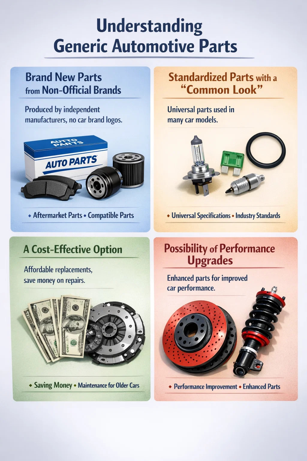 "Yleisosat" tai "tuotemerkin vaihtoehtoiset osat" ovat se, mitä me yleensä kutsumme autojen osat jotka eivät ole suoraan autonvalmistajan valmistamia, mutta ne voidaan asentaa täydellisesti autoon. Voit ajatella niitä "geneerisinä lääkkeinä" lääketeollisuudessa tai "kolmannen osapuolen lisävarusteina" matkapuhelimille.