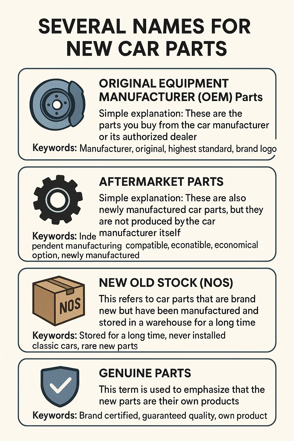 Upouusi auton osat niillä on useita yleisiä nimiä, jotka vaihtelevat hieman lähteensä ja luonteensa mukaan.