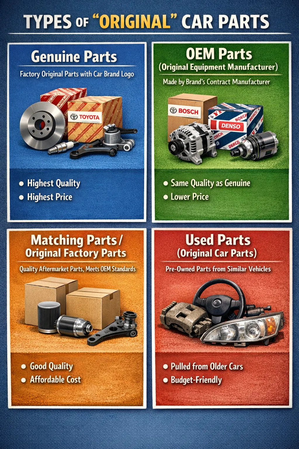 Kun ihmiset puhuvat "alkuperäisistä" auton osista, käyttää itse useita erilaisia termejä. Jos ei tarvitse kuulostaa samanlaisilta, meikkojen tai autonosien omistajien suussa monit termit edustavat eri hintapisteitä ja niiden alkuperää. auton osat .