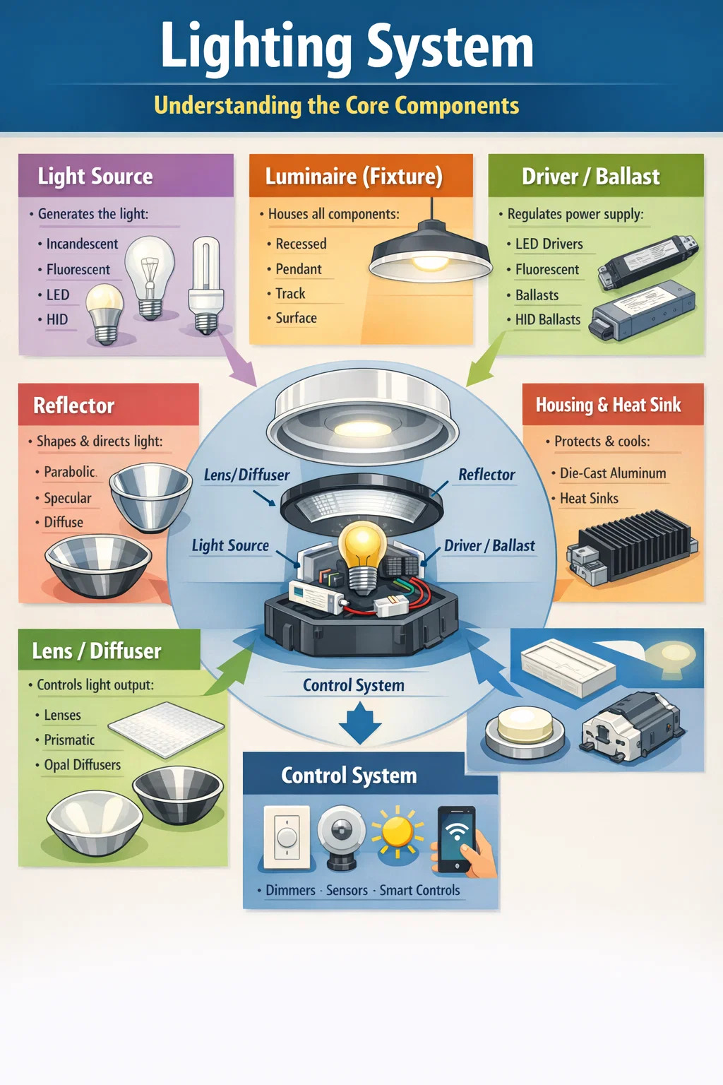 Valaistus ei ole vain valaistusta – se on huolellisesti suunniteltu järjestelmä, joka koostuu erillisistä, toisistaan riippuvaisista komponenteista. Valaistuksen ydinkomponentteja ovat valonlähde, valaisin (valaisin), liitäntälaite tai ohjain, heijastin, linssi tai diffuusori, kotelo ja ohjausjärjestelmä. Jokaisella osalla on erityinen rooli sen määrittämisessä, kuinka valoa tuotetaan, muotoillaan, jakautuu ja hallitaan. Olitpa suunnittelemassa kodin valaistussuunnitelmaa, perustamassa liiketilaa tai tekemässä vianetsintää olemassa olevaan asennukseen, näiden osien ymmärtäminen antaa sinulle ratkaisevan edun.